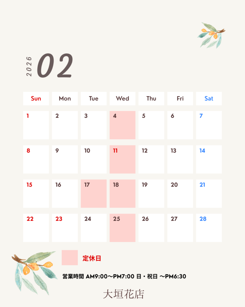 定休日:水曜日以外に、2月17日(火)がお休みになります。